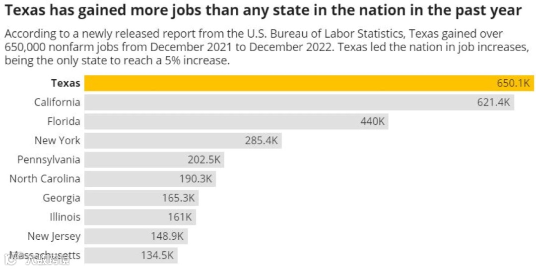 根据美国劳工统计局数据,2022年德州新增就业超过65万,就业增幅5%,均领先全美各州。