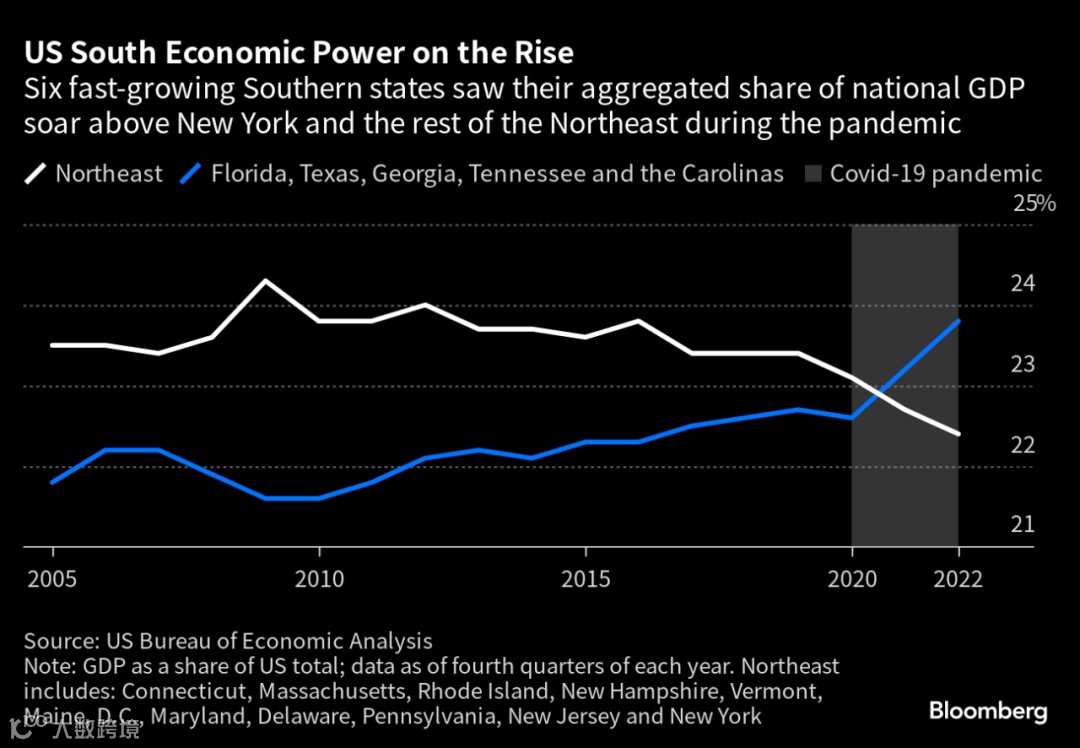 疫情期间六个快速增长的南方州GDP总量占全美GDP份额超过纽约和东北部其他地区(11州及华盛顿特区)
