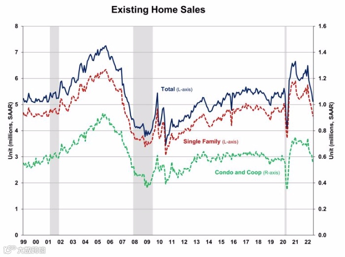 根据全美地产经纪人协会(National Association of Realtors®)数据,6月份全美二手房总销量(包括独栋别墅、联排别墅、和公寓等)环比5月下降5.4%,比去年同期下降14.2%,年化销量为512万套。