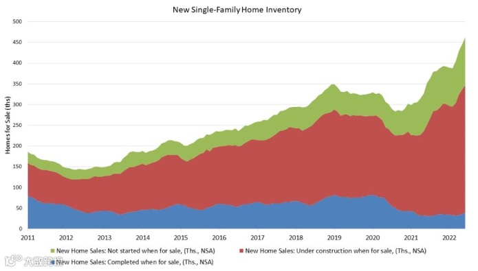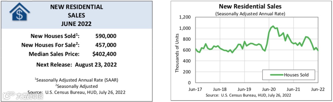 根据美国住房和城市发展及美国人口普查局数据,新房销售依旧受到高抵押贷款利率和通胀的影响,6月份的独栋别墅新屋销量经季调年化为59万套,较去年同期下降了11.6%。不仅如此,建商因建设及开发成本上升、人工短缺,及未来经济预期的影响,放缓了建设速度。