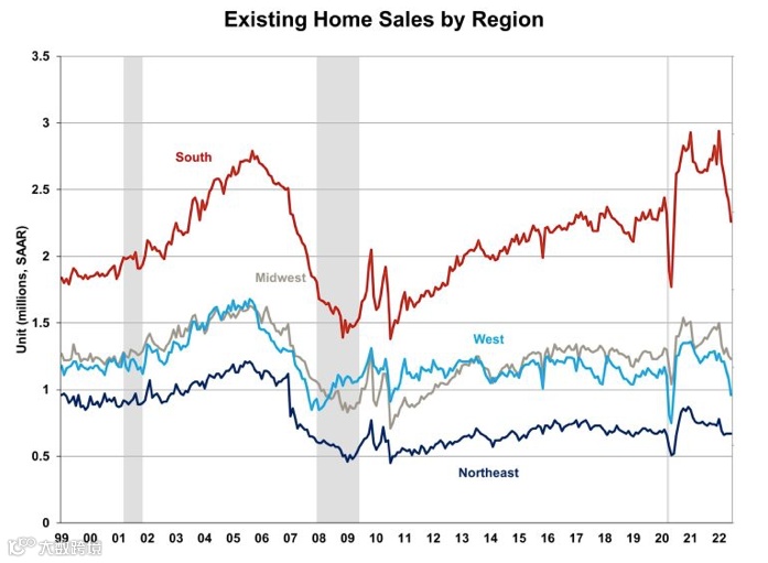 中西部地区的二手房销量环比下降1.6%,6月份的年化销量为123万套,同比下降9.6%。销售中位价为30.69万美元,同比增长10.2%。