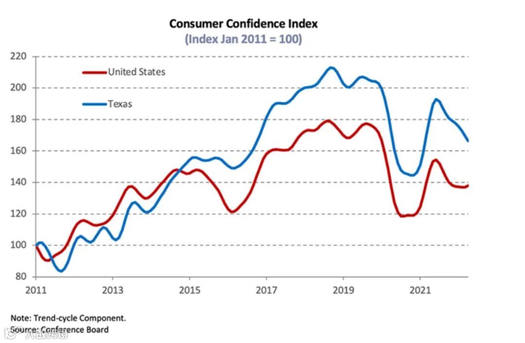 德州领先经济指数(衡量商业周期未来方向变化的指标)结束了后疫情时代的的扩张势头,标志着自2020年4月以来的首次收缩。另一方面,德州消费者信心指数升至今年的最高水平,创纪录的通货膨胀带动消费者情绪仍然积极。