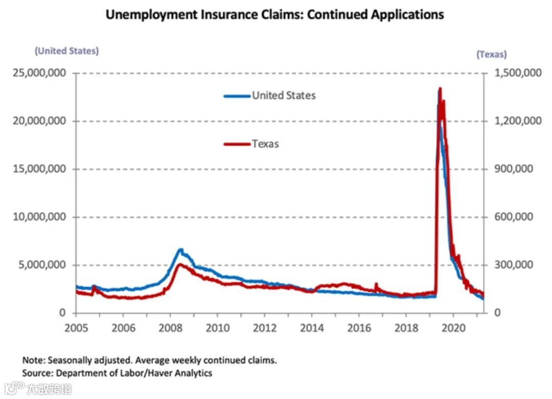 4月份,德州的民众首次申请失业保险的人数减少至58,000人,是去年的一半,是2019年底以来的最低水平(见图)。大都会区的申请失业保险的人数也缩水了大约一半。奥斯汀的每周申领人数最低,平均为700人,而圣安东尼奥的数据则徘徊在1,000人左右。在人口较多的达拉斯沃斯堡和大休斯顿地区,每周指标较高,有超过3,000人申请失业保险。德克萨斯州平均每周持续失业保险索赔报告为78,300份(经季节性调整)这是30年来的最低值,而该组数据自1987年以来的平均每周数据为162,500份。