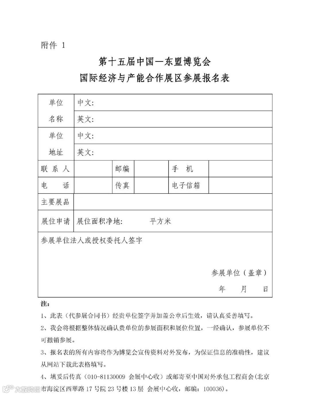 附件1:《第十五届中国—东盟博览会国际经济与产能合作展区参展报名表》