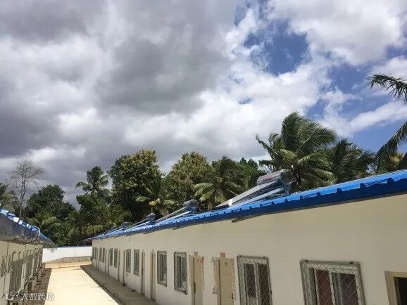 营地所有建筑物设置了钢结构彩钢瓦防晒通风层,钢结构与建筑物墙体使用预埋件焊接固定,牢固可靠,有效地起到了通风、保温、防漏、防风、防潮作用。每间房间设计有前后窗,既满足了采光要求,又保证了室内通风、防潮需求。根据斯里兰卡当地日照时间长的特点,营地内每间房屋配备遮阳窗帘,避免阳光直射,降低空调的能耗,同时保证了室内适宜的温度。