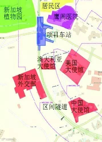 项目所在的区域分布有许多重要建筑,如上图所示,项目车站紧靠新加坡外交部、澳大利亚大使馆、美国大使馆、鹰阁医院、新加坡植物园及居民楼;盾构隧道穿越区域除各国使馆外,还有不少当地显贵的府邸;车站主体位于交通要道荷兰路正下方,施工过程中必须保证不影响车辆通行。