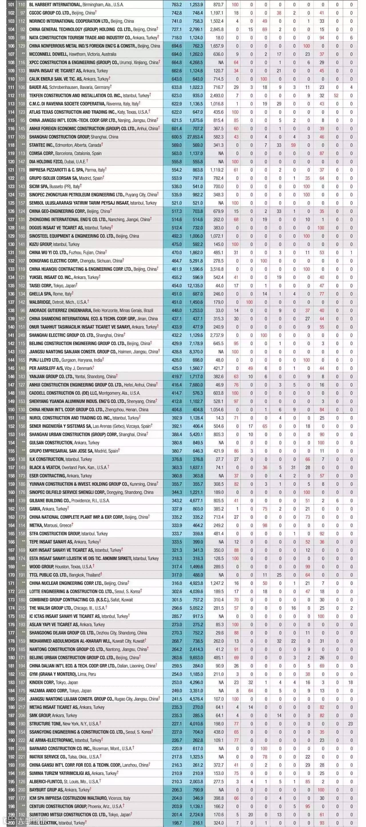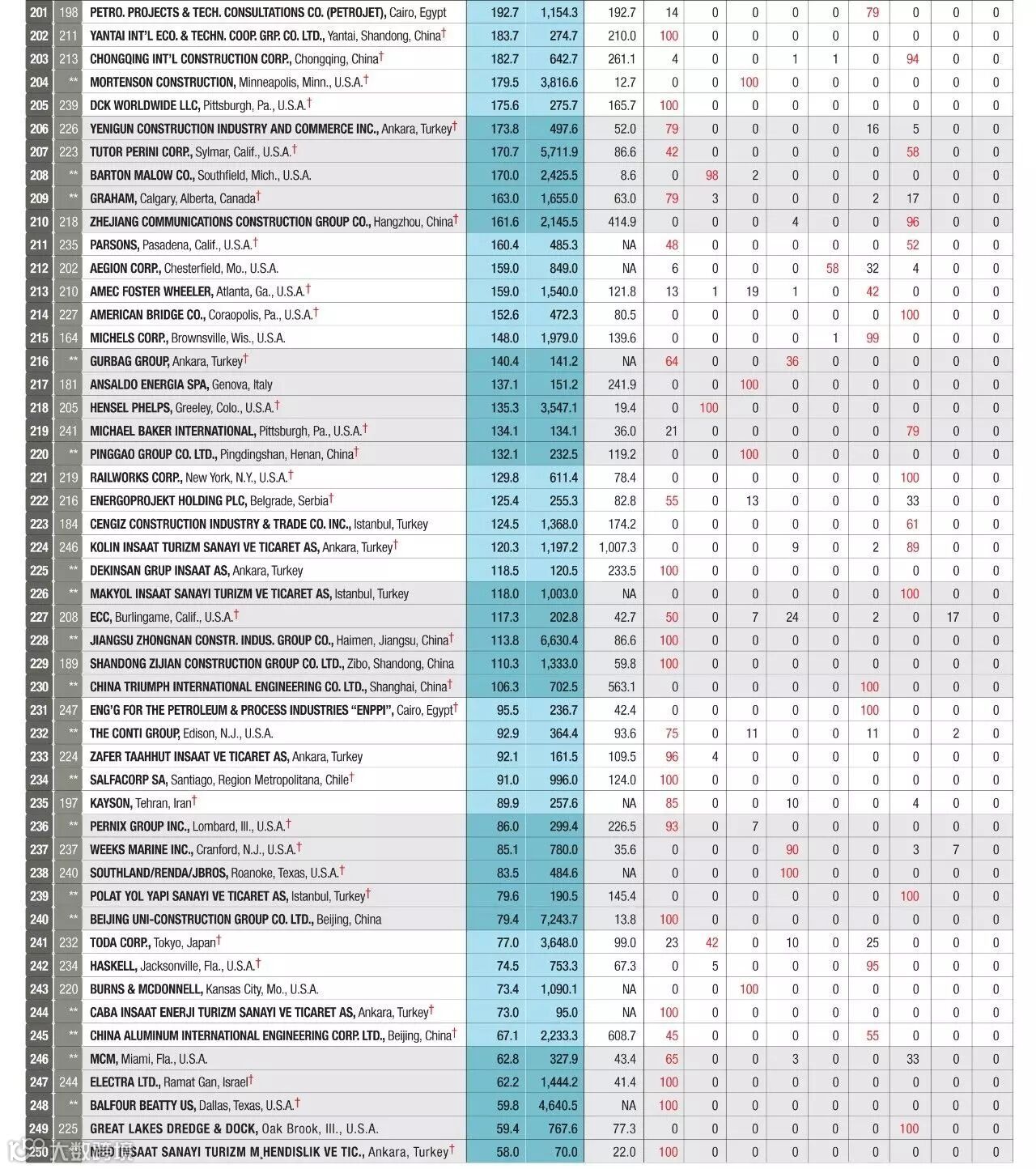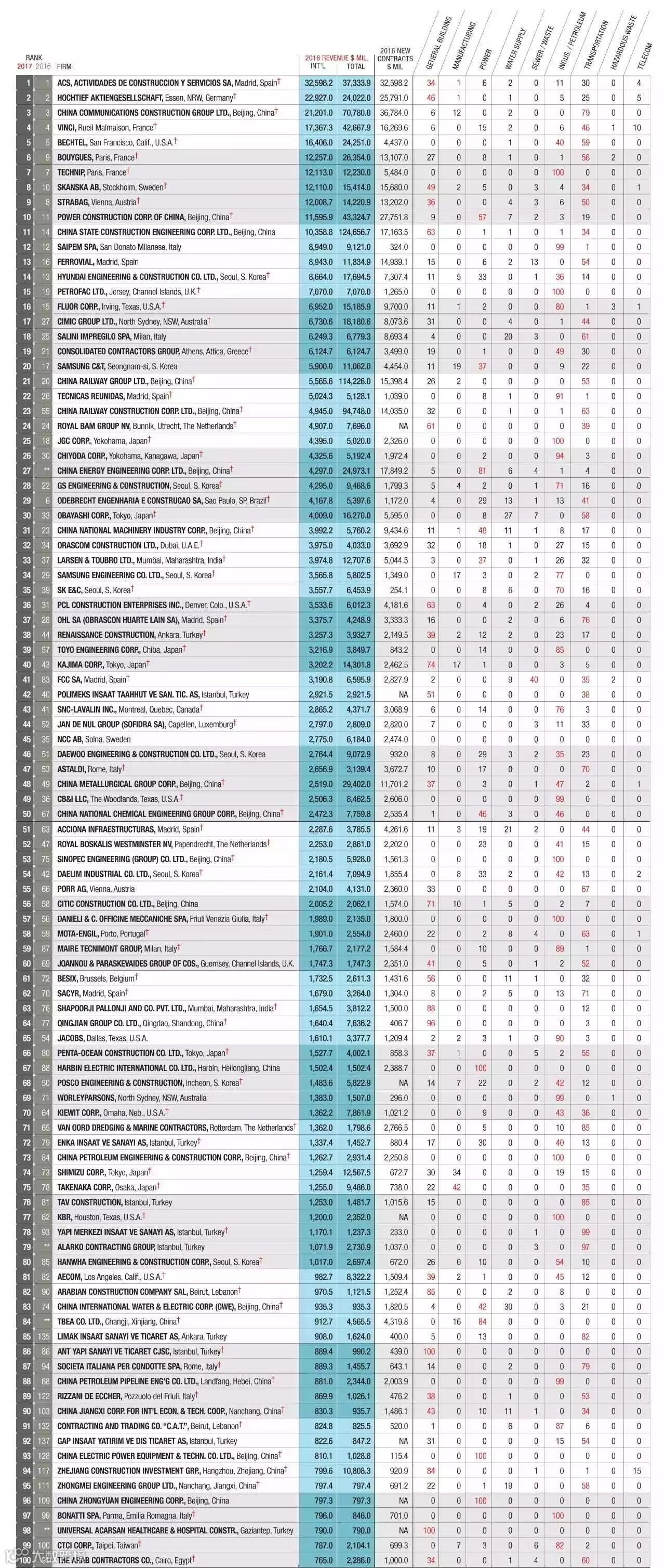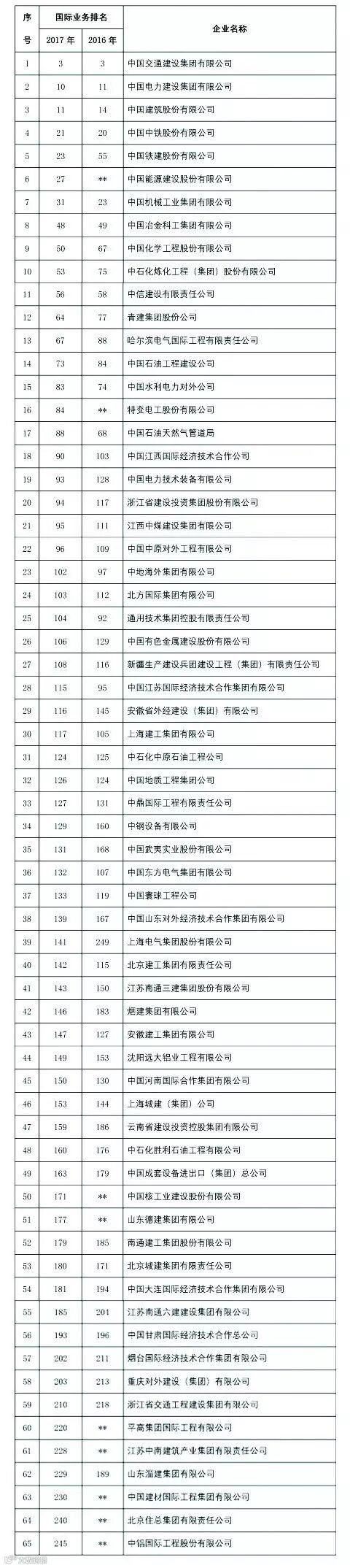 导读:一、2017年度全球最大250家国际承包商名单二、入选2017年度ENR全球最大250家国际承包商的我国65家内地企业名单