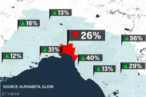 澳大利亚的另一大城市墨尔本的市区消费大幅度下降了26%,与之相反,墨尔本一些郊区的消费值实现了强劲增长,某些地区的消费增长了56%。