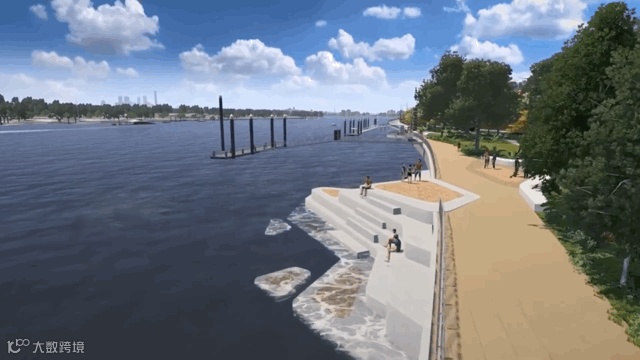河边修建休闲广场和纪念公园满足居民的娱乐生活。