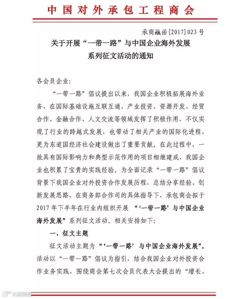 为全面记录“一带一路”倡议背景下我国企业对外投资合作发展历程,总结分享经验、创新发展思路,在商务部合作司的具体指导下,承包商会拟于2017年下半年在行业内组织开展 “‘一带一路’与中国企业海外发展”系列征文活动。相关安排如下: