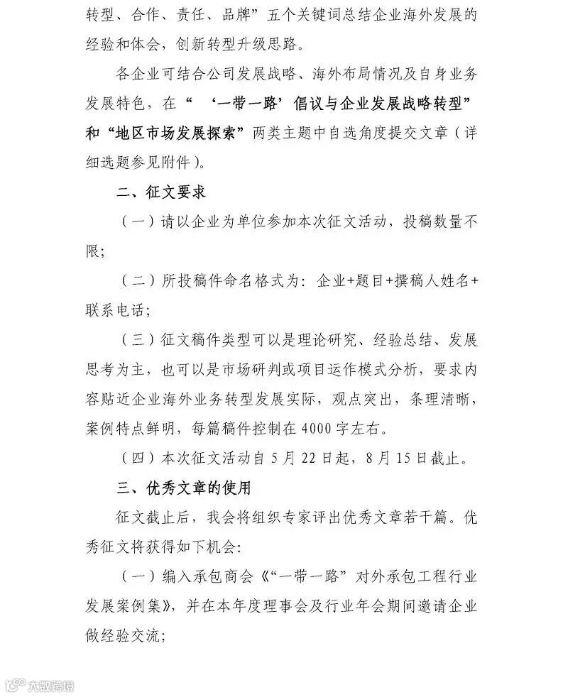 为保证活动顺利开展,全面展现“一带一路”倡议背景下我国对外承包工程企业发展取得的成效和行业新风,请各会员企业重视本次征文工作,积极组织集团及下属企业参与,踊跃投稿。相关稿件电子版请于8月15日前发送至承包商会。