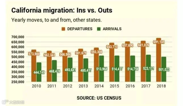 那么到底有多少“辛格”每年“逃离加州”呢?从以上表格可以看出,从2011年开始,加州的人口流失率一直在增加,7年来,每年的人口流失量从56万增长到69万。2018年有约69万人“逃离加州”,使得加州再一次成为全美人口流失量最多的州。与此同时,只有约50万人迁入加州,创下最近5年来的新低,人口净流失量超过19万人,根据数据显示,这19万“逃离加州”的人中,有超过8.6万人的首选地是德克萨斯州。