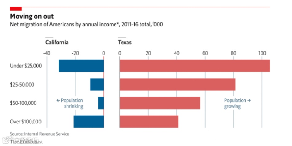 在加州,2011年到2016年之间,每一个外州人进入加州买房,就有两名以上的加州人卖掉他们的房子搬出加州。数据发现,在德州,进入这里的买家要比离开的卖家多。在房地产业复苏的状况下,这个趋势仍然在加速发展。越来越多的人离开加州。