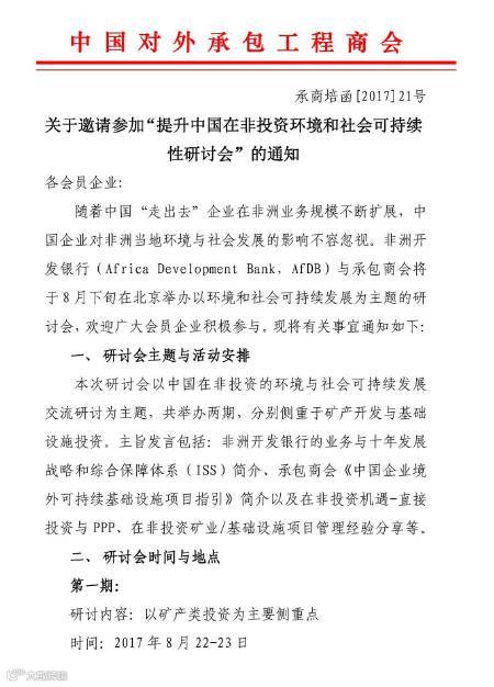 随着中国“走出去”企业在非洲业务规模不断扩展,中国企业对非洲当地环境与社会发展的影响不容忽视。非洲开发银行(Africa Development Bank,AfDB)与承包商会将于8月下旬在北京举办以环境和社会可持续发展为主题的研讨会,欢迎广大会员企业积极参与。现将有关事宜通知如下: