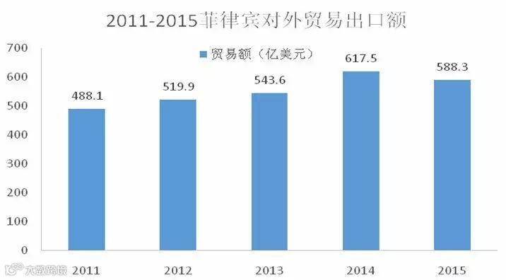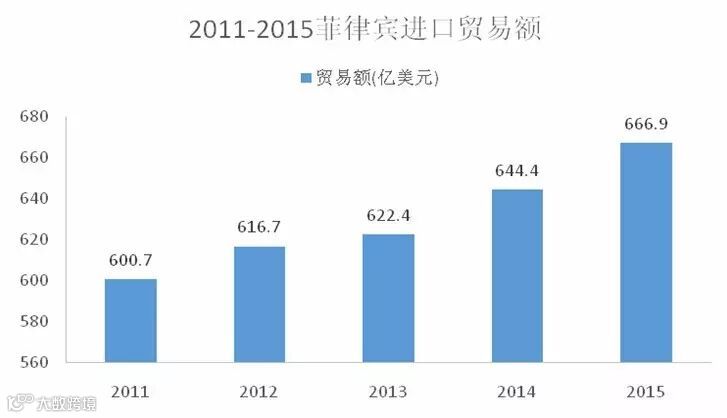 数据显示,菲律宾对外贸易上升主要是由于进口额的上升。2015年进口总额为666.9亿美元,而出口总额为588.3亿美元,贸易逆差122.4亿美元,2014年逆差仅32.97亿美元。