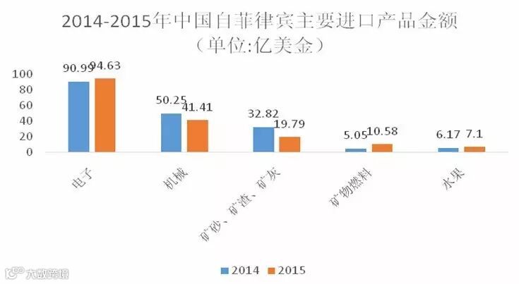 从产品结构上看,2015年全年,中国自菲律宾进口的前5位产品有电子,机械,矿砂、矿渣及矿灰,矿物燃料和食用水果,累计进口总额达172.16亿美元,占中国自菲律宾进口产品总额的18.8%。其中,电子是第一大进口产品,进口额达94.63亿美元,同比增长0.4%;其次是机械,进口额为41.41亿美元,同比下降17.6%;再者是矿砂、矿渣及矿灰,进口19.79亿美元,同比下降39.7%;矿物燃料位居第四,进口10.58亿美元,同比激增109.3%;食用水果进口最少,进口额为5.75亿美元,同比下降7.1%。