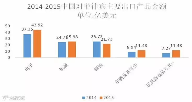 中国对菲律宾出口的前5位产品是电子,机械,钢铁,车辆及其零件和玩具、游戏品、运动用品及其零件、附件,累计出口总额达112.98亿美元,占中国对菲律宾出口产品总额的12.4%。其中,电子出口第一,出口额为43.92亿美元,同比增长17.6%;其次是机械,出口25.38亿美元,同比增长2.7%;再者是钢铁,出口21.73亿美元,同比下降15.5%;车辆及其零件位居第四,出口11.48亿美元,同比增长28.4%;对玩具、游戏品、运动用品及其零件、附件出口最少,出口额为10.46亿美元,同比增长43.9%。从两国进出口产品来看,两国进出口产品有互补效应,两国的经贸合作趋于多元化。