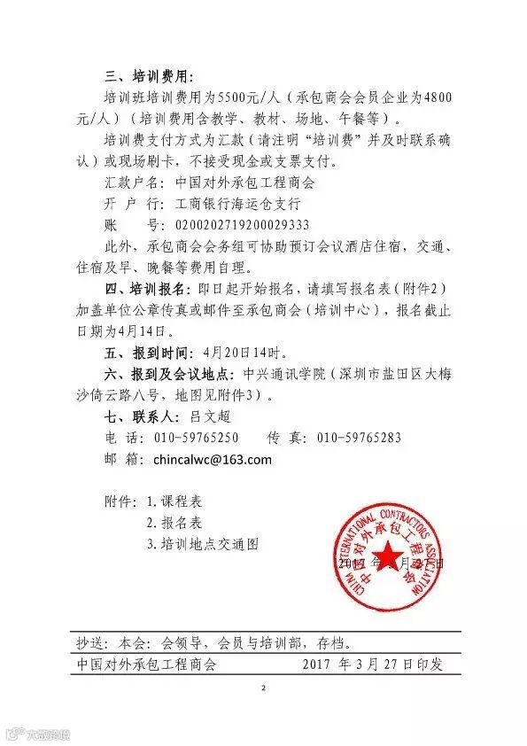 培训班培训费用为5500元/人(承包商会会员企业为4800元/人)(培训费用含教学、教材、场地、午餐等)。