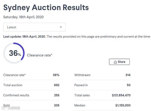 清盘率36%,售出总价$121,854,470澳元,中位价$1,155,000澳元。