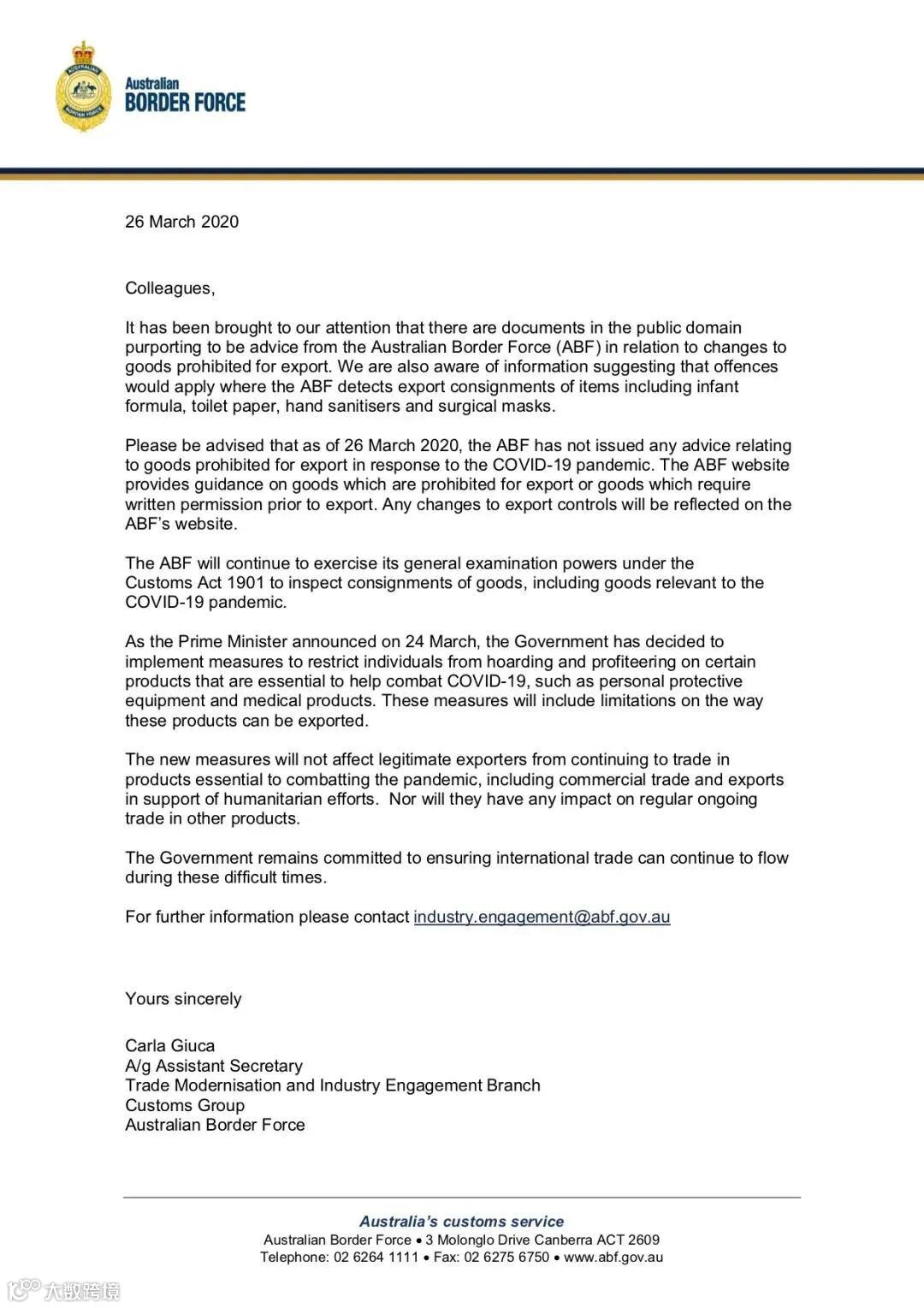 截止目前为止,澳洲海关没有发出任何新的声明。澳洲海关执行准则目前都可在澳洲海关网站(www.abf.gov.au)进行查询,如果有任何新条例发布,我们会第一时间进行跟进,任何变动会进行告知后再执行。