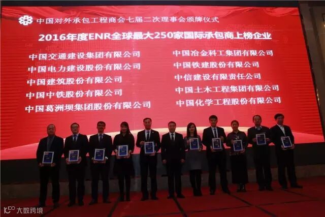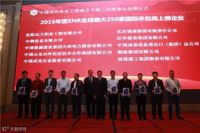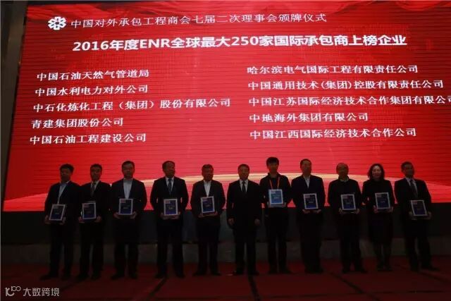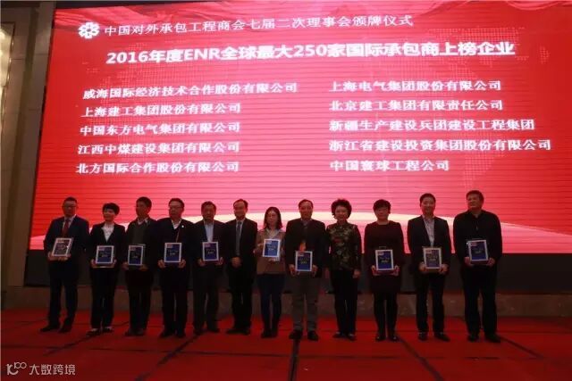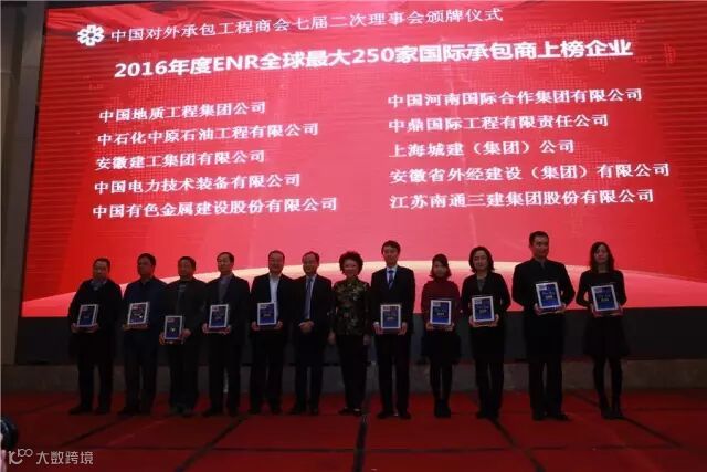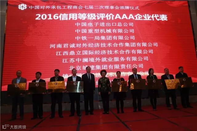 承包商会第七次会员代表大会期间,2016年度的对外承包工程与劳务合作企业信用等级评价AAA级企业名单及ENR颁奖仪式在江西南昌举行,中国对外承包工程商会会长房秋晨、副会长王禾等领导分别为获奖企业代表颁发奖牌。