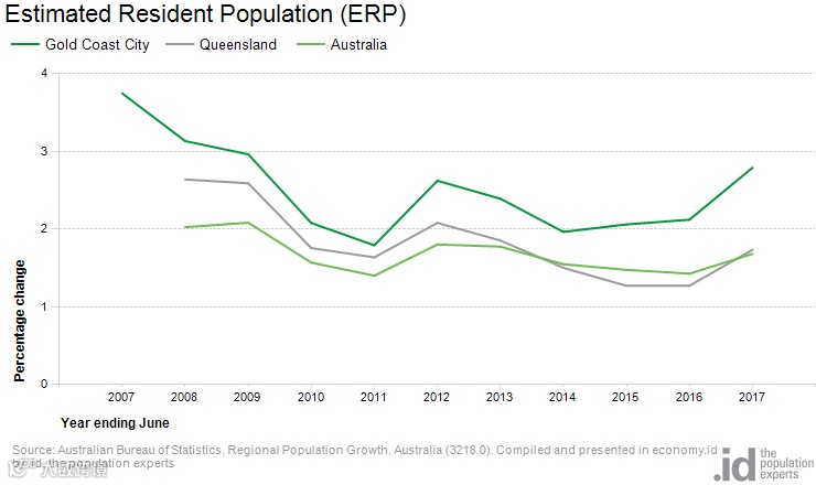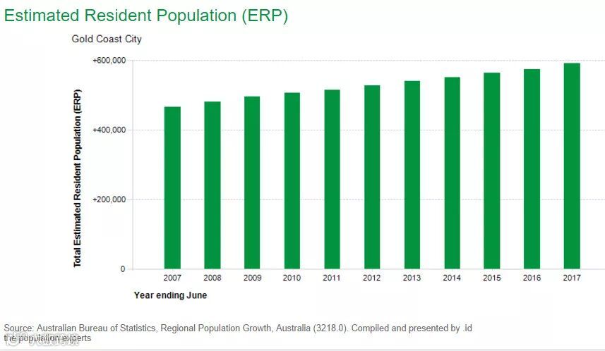 从2007年至今,黄金海岸人口大幅上涨,成为澳大利亚人口增长最快的地区之一。黄金海岸常住人口增速远超澳洲和昆士兰州的平均水平。