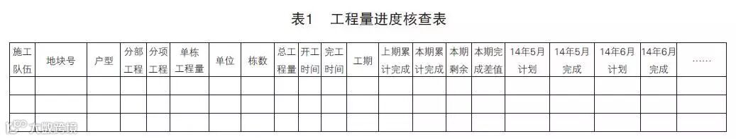 工程量进度核查表(见表1),根据总的施工计划横道图,把所涉及的各施工工序,按地块、户型,列出工程量,并在后面时间数轴上,列出每个月的计划完成数量。在实际操作中,把每个月的实际完成数量与计划完成数量进行比较,然后把差值再分配到后期的计划中,以达到计划实时更新。