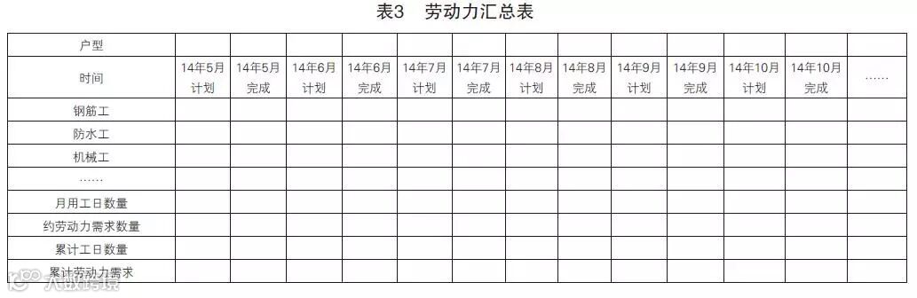 劳动力定额表(见表2),按前面“表1”所列的工序,把每个工序中所需要的各工种劳务人员的定额分别列出,然后运用函数连接,计算每月完成“表1”计划工程量所需的劳务人员工日数。然后把各工序所需的劳动力进行汇总,得出劳动力汇总表(见表3)。通过劳动力汇总表可以看出各月份各工种的计划工日数,即可以算出每月各工种的需求人数。另外,为了保证各工种人数不出现窝工或赶工等情况,排施工计划时,要尽量保证各劳务工种人数的均衡性(即人数需求的波动较小)。这也是国外工程中编排施工进度计划的重要参照依据之一。