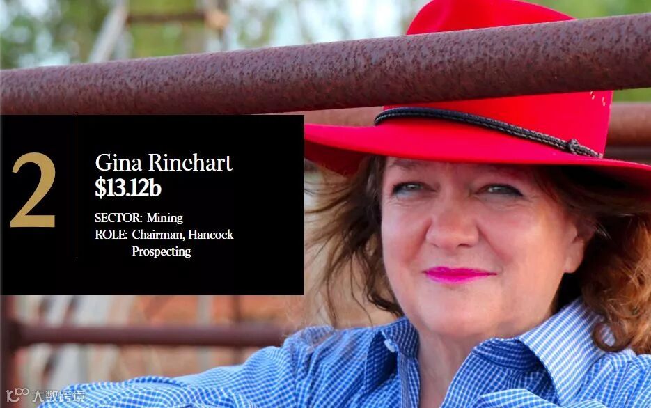 Gina Rinehart,仅以0.2亿澳元差距屈居第二。她是澳大利亚矿业巨头,更是商界铁娘子,是唯一一位进入前十名的女性。