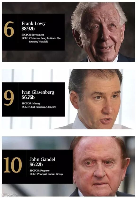 富豪榜前十名中,除了Anthony Pratt和Harry Triguboff以外,89.2亿澳元排名第六的Westfield创始人Frank Lowy、67.6亿澳元排名第九的能源巨头Glencore Xstrata的Ivan Glasenberg、62.2亿澳元排名第十的地产巨头Gandel Group的John Gandel都是出生在海外,在澳大利亚发家致富的移民富豪。
