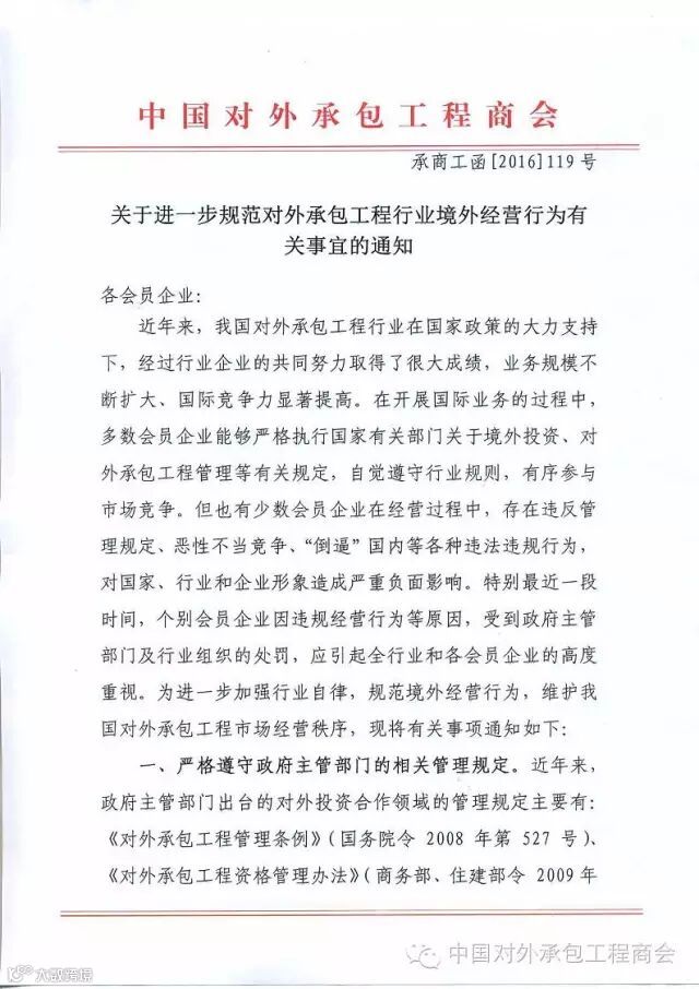 近年来,我国对外承包工程行业在国家政策的大力支持下,经过行业企业的共同努力取得了很大成绩,业务规模不断扩大、国际竞争力显著提高。在开展国际业务的过程中,多数会员企业能够严格执行国家有关部门关于境外投资、对外承包工程管理等有关规定,自觉遵守行业规则,有序参与市场竞争。但也有少数会员企业在经营过程中,存在违反管理规定、恶性不当竞争、“倒逼”国内等各种违法违规行为,对国家、行业和企业形象造成严重负面影响。特别最近一段时间,个别会员企业因违规经营行为等原因,受到政府主管部门及行业组织的处罚,应引起全行业和各会员企业的高度重视。为进一步加强行业自律,规范境外经营行为,维护我国对外承包工程市场经营秩序,现将有关事项予以通知。详见附件。