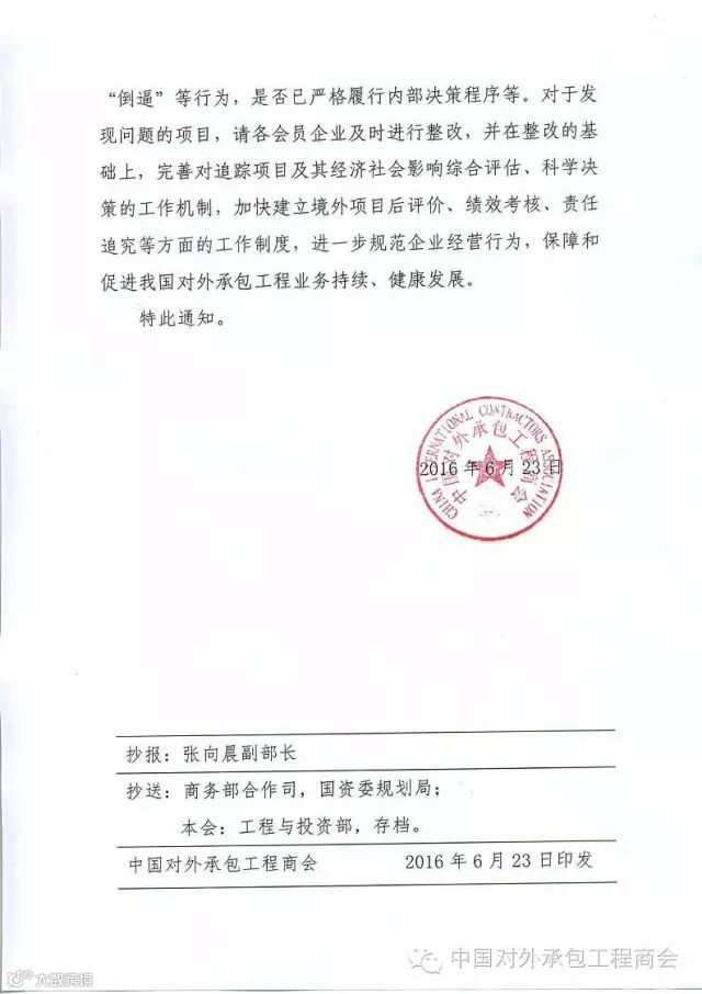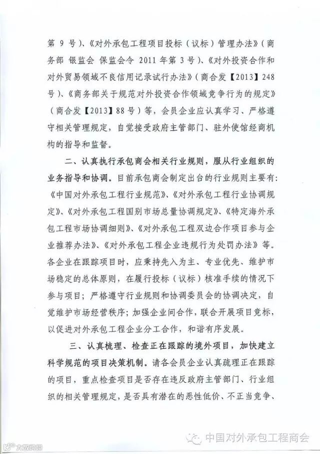 三、认真梳理、检查正在跟踪的境外项目,加快建立科学规范的项目决策机制。请各会员企业认真疏理正在跟踪的项目,重点检查项目是否存在违反政府主管部门、行业组织的相关管理规定,是否具有潜在的恶性低价、不正当竞争、“倒逼”等行为,是否已严格履行内部决策程序等。对于发现问题的项目,请各会员企业及时进行整改,并在整改的基础上,完善对追踪项目及其经济社会影响综合评估、科学决策的工作机制,加快建立境外项目后评价、绩效考核、责任追究等方面的工作制度,进一步规范企业经营行为,保障和促进我国对外承包工程业务持续、健康发展。