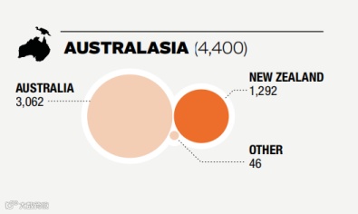 目前大洋洲区(包括澳大利亚、新西兰与邻近岛国)的超高净值人士为4400人,其中包括澳洲的3062人,大洋洲区的超高净值人士规模将在未来5年内增长22%。