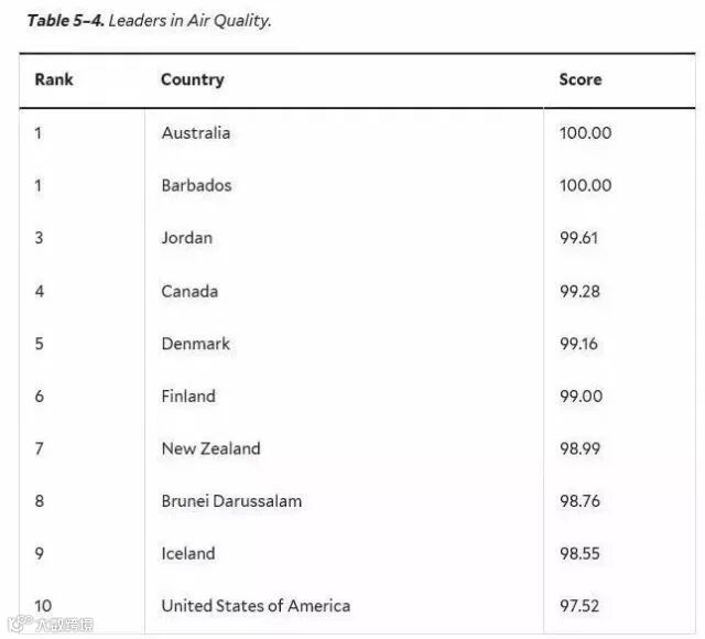 空气质量排名中是,前十名的国家还有:1、澳大利亚;2、巴巴多斯;3、约旦;4、加拿大;5、丹麦;6、芬兰;7、新西兰;8、文莱;9、冰岛;10、美国。