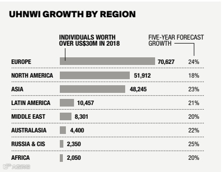 预计未来5年亚洲地区超高净值人群增长最快,印度将增加39%,其次是菲律宾(38%)和中国(35%)。未来5年超高净值人群增长最快的10个国家中,有8个将在亚洲。