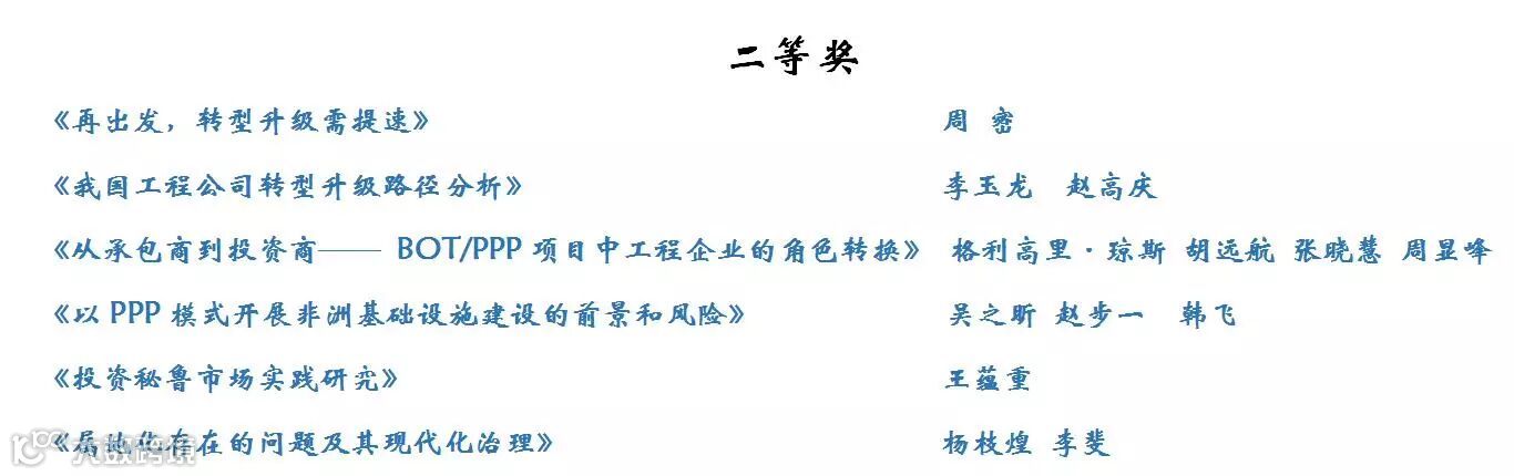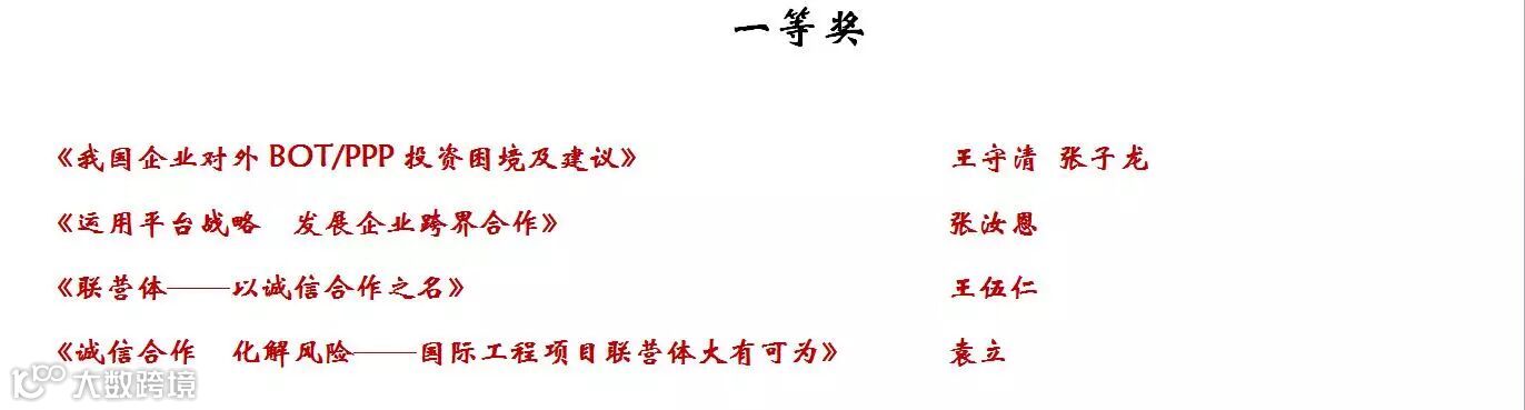 杂志社邀请了专家评委对专题征文稿件进行评审,共评选出一等奖稿件4篇,二等奖6篇,三等奖9篇。另外,还评选出誉奖作者21名。获奖篇目作者及荣誉奖作者均获赠《国际工程与劳务》2016年全年杂志。