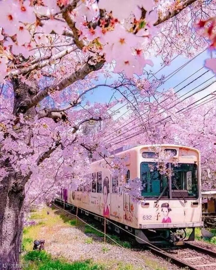 岚山电铁北野线从宇多野到鸣淹之间的一段铁路, 美丽的樱花伫立在铁道两旁,映衬着一列又一列或黄或绿的电车,吸引了许多旅客前来打卡。圆山公园是京都最古老的公园,种植大约近900株樱花,其中最有名的祇园垂枝樱,从1866年至今世代传承。
