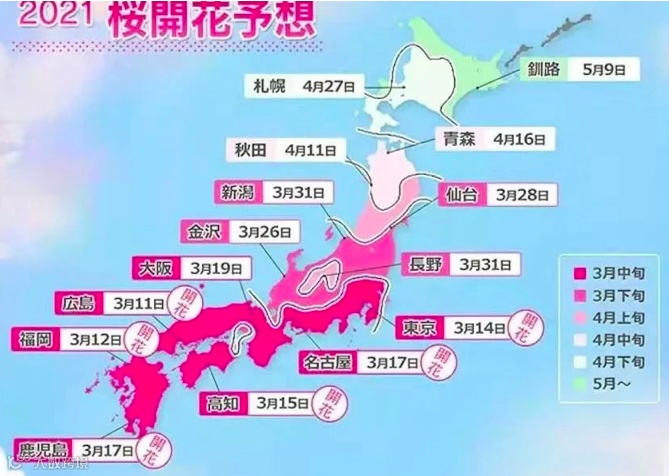 樱花最早绽放是从日本南端的冲绳开始,一直到北端的北海道。樱花的绽放时间十分短暂,从盛开至凋零只有短短的一周左右的时间,或许只是一阵不经意间的风雨,满树的花瓣便会纷纷飘零,散落地面。