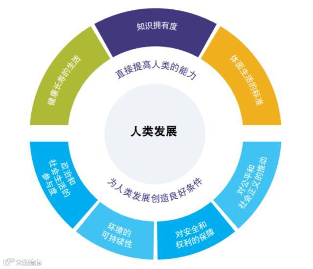 工业化水平;生活品质;知识拥有度;健康长寿的生活;政治和社会生活的参与度;环境的可持续性;对安全和权利的保障;对公平和社会正义的推动。