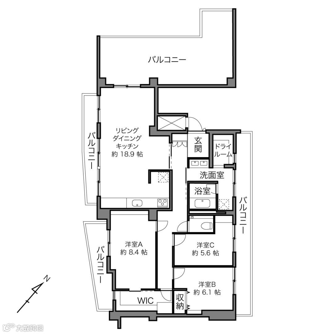 面积:1983年4月建,鉄筋コンクリート造,5层共5层,3LDK+WIC,房产面积101.69平米,阳台面积46.89平米;