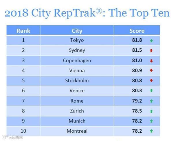 声誉研究所 (Reputation Institute) 是一家专门从事声誉调查的咨询和顾问公司。该公司的年度全球声誉最佳城市报告,以安全性、城市美丽度和领导能力为标准,调查分析了全球56个城市的表现。
