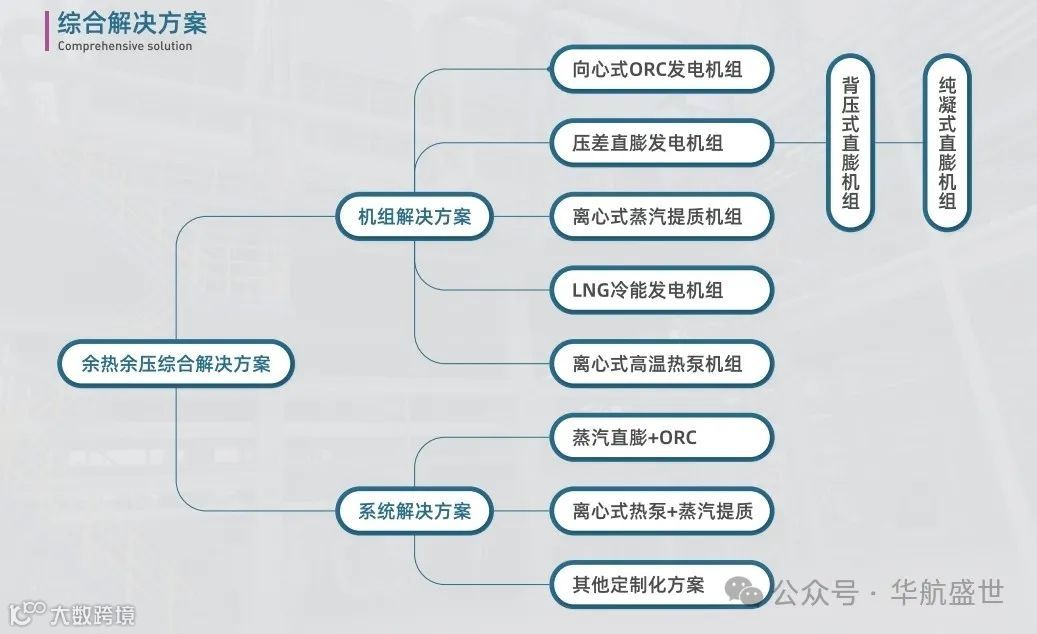 华航盛世提供ORC余热能量回收、蒸汽减温减压压差透平直膨发电、低品位蒸汽加压提质机组、高温热泵耦合利用技术等: