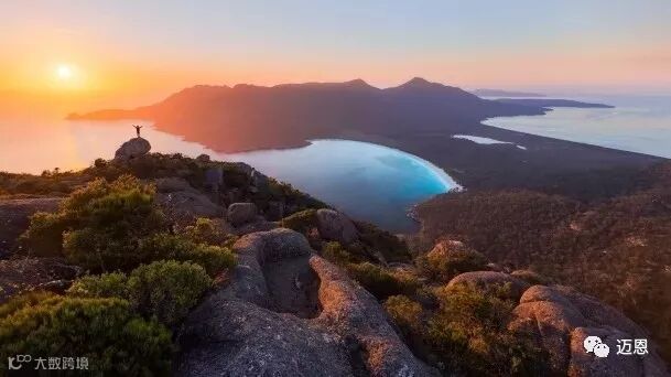 位于塔州菲欣纳半岛(Freycinet Peninsula)的酒杯湾(Wineglass Bay)是全球公认的十大美丽海滩之一,以其绿松石般的蔚蓝海域和具有完美弧度的白色沙滩而闻名。在日出之时,耀眼的白沙、湛蓝的海水和璀璨的阳光相映成趣,绚丽得令人迷醉,绝美得令人窒息。除此之外,这里的岩石由于含有氧化铁,在太阳的照射下,会呈现出粉红色,简直让人少女心满满!