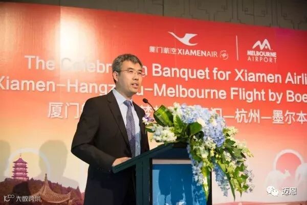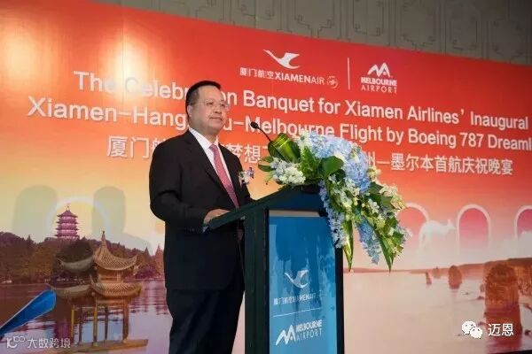 2017年12月17日晚上六点厦门航空在墨尔本皇冠酒店举行首航庆典,维州议会立法会主席Bruce Atkinson、中国驻墨尔本总领事馆总领事赵建、墨尔本机场首席执行官Lyell Strambi应邀出席晚宴。