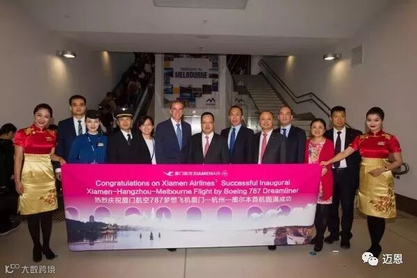 厦门航空董事长车尚轮亲自带队乘坐首航航班飞抵墨尔本,,接机嘉宾有中国驻墨尔本总领事馆参赞王晓佳、墨尔本市政府市议员刘乐、墨尔本机场首席执行官Lyell Strambi等澳洲政要和知名人士。