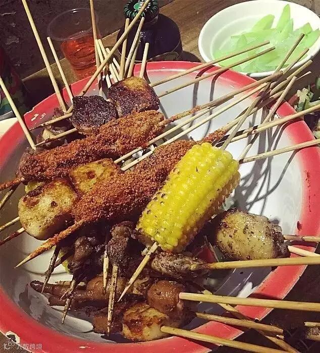 他们家烤串不是用盘子装,用的竟然是小时候洗脸用的搪瓷脸盆!?这样一脸盆的烤串吃起来也太爽了!!
