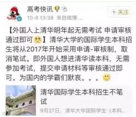 “从明年开始,外国人上清华无需考试,申请审核通过即可”!