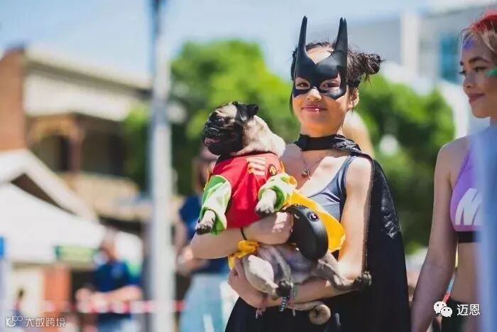大部分狗主人也有化妆以配合自家宠物狗的造型。一名女子扮成了蝙蝠侠(Batman),她的狗则扮成了蝙蝠侠的搭档罗宾汉(Robin)。