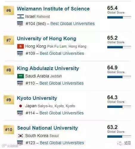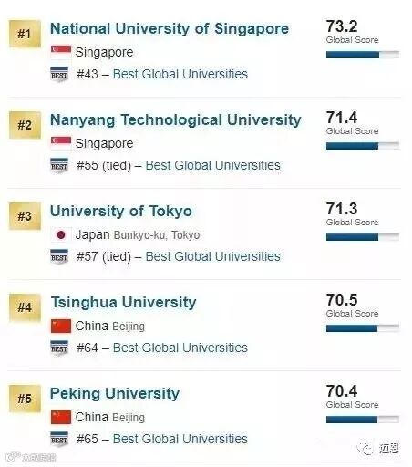 其余的亚洲名校,包括南洋理工大学、日本东京大学,都排在了全球50名之外。