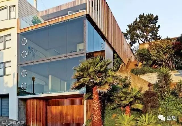 玻璃幕墙让住在这座山中居所的夫妇得以俯瞰旧金山教会区的全貌。室内的百叶窗如相机的光圈一般,为这座城市的风景加上了边框。